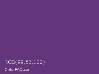 RGB 99,53,122 Color is a normal purple color and the nearest color is Eminence #6c3082. Hex code #63357a and RGB value is rgb(99,53,122). In RGB color space, this color is composed of 39% red, 21% green, 48% blue, In CMYK color space, this color is composed of 19% cyan, 57% magenta, 0% yellow , 52% black , In HSL color space, this color has a hue angle of 280° , 39% saturation and 34% lightness.