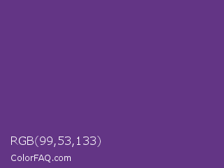 RGB 99,53,133 Color is a normal purple color and the nearest color is Eminence #6c3082. Hex code #633585 and RGB value is rgb(99,53,133). In RGB color space, this color is composed of 39% red, 21% green, 52% blue, In CMYK color space, this color is composed of 26% cyan, 60% magenta, 0% yellow , 48% black , In HSL color space, this color has a hue angle of 275° , 43% saturation and 36% lightness.