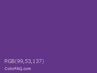 RGB 99,53,137 Color is a normal purple color and the nearest color is Eminence #6c3082. Hex code #633589 and RGB value is rgb(99,53,137). In RGB color space, this color is composed of 39% red, 21% green, 54% blue, In CMYK color space, this color is composed of 28% cyan, 61% magenta, 0% yellow , 46% black , In HSL color space, this color has a hue angle of 273° , 44% saturation and 37% lightness.