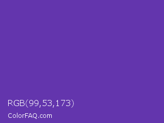 RGB 99,53,173 Color is a normal violet color and the nearest color is Grape #6f2da8. Hex code #6335ad and RGB value is rgb(99,53,173). In RGB color space, this color is composed of 39% red, 21% green, 68% blue, In CMYK color space, this color is composed of 43% cyan, 69% magenta, 0% yellow , 32% black , In HSL color space, this color has a hue angle of 263° , 53% saturation and 44% lightness.