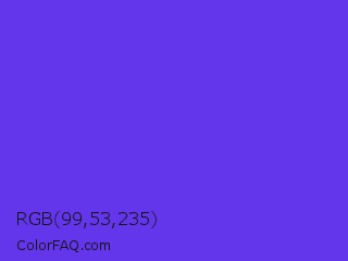 RGB 99,53,235 Color is a normal indigo color and the nearest color is Majorelle Blue #6050dc. Hex code #6335eb and RGB value is rgb(99,53,235). In RGB color space, this color is composed of 39% red, 21% green, 92% blue, In CMYK color space, this color is composed of 58% cyan, 77% magenta, 0% yellow , 8% black , In HSL color space, this color has a hue angle of 255° , 82% saturation and 56% lightness.