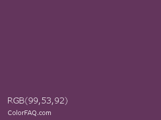 RGB 99,53,92 Color is a dark magenta color and the nearest color is Ube Halaya #663854. Hex code #63355c and RGB value is rgb(99,53,92). In RGB color space, this color is composed of 39% red, 21% green, 36% blue, In CMYK color space, this color is composed of 0% cyan, 46% magenta, 7% yellow , 61% black , In HSL color space, this color has a hue angle of 309° , 30% saturation and 30% lightness.