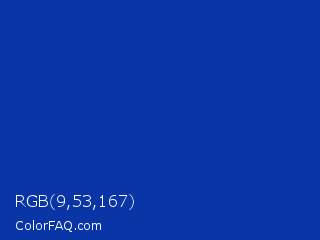 RGB 9,53,167 Color is a normal blue color and the nearest color is Egyptian Blue #1034a6. Hex code #0935a7 and RGB value is rgb(9,53,167). In RGB color space, this color is composed of 4% red, 21% green, 65% blue, In CMYK color space, this color is composed of 95% cyan, 68% magenta, 0% yellow , 35% black , In HSL color space, this color has a hue angle of 223° , 90% saturation and 35% lightness.