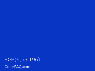 RGB 9,53,196 Color is a normal blue color and the nearest color is Persian Blue #1c39bb. Hex code #0935c4 and RGB value is rgb(9,53,196). In RGB color space, this color is composed of 4% red, 21% green, 77% blue, In CMYK color space, this color is composed of 95% cyan, 73% magenta, 0% yellow , 23% black , In HSL color space, this color has a hue angle of 226° , 91% saturation and 40% lightness.