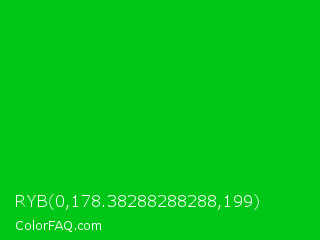 RYB 0,178.38288288288,199 Color is a normal green color and the nearest color is Vivid Malachite #00cc33. Hex code #00c717 and RGB value is rgb(0,199,23). In RGB color space, this color is composed of 0% red, 78% green, 9% blue, In CMYK color space, this color is composed of 100% cyan, 0% magenta, 88% yellow , 22% black , In HSL color space, this color has a hue angle of 127° , 100% saturation and 39% lightness.