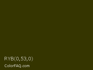 RYB 0,53,0 Color is a very dark yellow color and the nearest color is Madras #3f3002. Hex code #353500 and RGB value is rgb(53,53,0). In RGB color space, this color is composed of 21% red, 21% green, 0% blue, In CMYK color space, this color is composed of 0% cyan, 0% magenta, 100% yellow , 79% black , In HSL color space, this color has a hue angle of 60° , 100% saturation and 10% lightness.