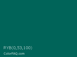 RYB 0,53,100 Color is a very dark cyan color and the nearest color is Blue Stone #016162. Hex code #006459 and RGB value is rgb(0,100,89). In RGB color space, this color is composed of 0% red, 39% green, 35% blue, In CMYK color space, this color is composed of 100% cyan, 0% magenta, 11% yellow , 61% black , In HSL color space, this color has a hue angle of 173° , 100% saturation and 20% lightness.