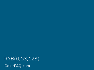 RYB 0,53,128 Color is a dark blue color and the nearest color is Orient #015e85. Hex code #005a80 and RGB value is rgb(0,90,128). In RGB color space, this color is composed of 0% red, 35% green, 50% blue, In CMYK color space, this color is composed of 100% cyan, 30% magenta, 0% yellow , 50% black , In HSL color space, this color has a hue angle of 198° , 100% saturation and 25% lightness.