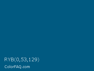 RYB 0,53,129 Color is a dark blue color and the nearest color is Orient #015e85. Hex code #005a81 and RGB value is rgb(0,90,129). In RGB color space, this color is composed of 0% red, 35% green, 51% blue, In CMYK color space, this color is composed of 100% cyan, 30% magenta, 0% yellow , 49% black , In HSL color space, this color has a hue angle of 198° , 100% saturation and 25% lightness.