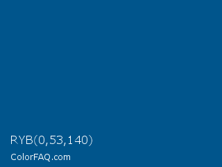RYB 0,53,140 Color is a dark blue color and the nearest color is Venice Blue #055989. Hex code #00558c and RGB value is rgb(0,85,140). In RGB color space, this color is composed of 0% red, 33% green, 55% blue, In CMYK color space, this color is composed of 100% cyan, 39% magenta, 0% yellow , 45% black , In HSL color space, this color has a hue angle of 204° , 100% saturation and 27% lightness.