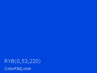 RYB 0,53,220 Color is a normal blue color and the nearest color is Absolute Zero #0048ba. Hex code #0046dc and RGB value is rgb(0,70,220). In RGB color space, this color is composed of 0% red, 27% green, 86% blue, In CMYK color space, this color is composed of 100% cyan, 68% magenta, 0% yellow , 14% black , In HSL color space, this color has a hue angle of 221° , 100% saturation and 43% lightness.