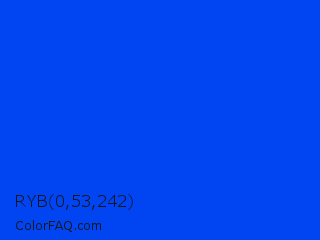 RYB 0,53,242 Color is a normal blue color and the nearest color is Blue RYB #0247fe. Hex code #0044f2 and RGB value is rgb(0,68,242). In RGB color space, this color is composed of 0% red, 27% green, 95% blue, In CMYK color space, this color is composed of 100% cyan, 72% magenta, 0% yellow , 5% black , In HSL color space, this color has a hue angle of 223° , 100% saturation and 47% lightness.