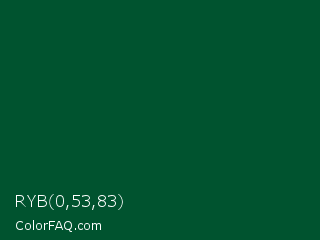 RYB 0,53,83 Color is a very dark green color and the nearest color is Sacramento State Green #00563f. Hex code #00532f and RGB value is rgb(0,83,47). In RGB color space, this color is composed of 0% red, 33% green, 18% blue, In CMYK color space, this color is composed of 100% cyan, 0% magenta, 43% yellow , 67% black , In HSL color space, this color has a hue angle of 154° , 100% saturation and 16% lightness.