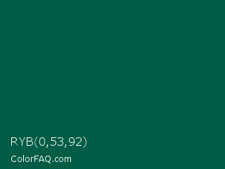 RYB 0,53,92 Color is a very dark cyan color and the nearest color is Sacramento State Green #00563f. Hex code #005c44 and RGB value is rgb(0,92,68). In RGB color space, this color is composed of 0% red, 36% green, 27% blue, In CMYK color space, this color is composed of 100% cyan, 0% magenta, 26% yellow , 64% black , In HSL color space, this color has a hue angle of 164° , 100% saturation and 18% lightness.