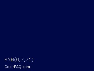RYB 0,7,71 Color is a very dark blue color and the nearest color is Stratos #000741. Hex code #000847 and RGB value is rgb(0,8,71). In RGB color space, this color is composed of 0% red, 3% green, 28% blue, In CMYK color space, this color is composed of 100% cyan, 89% magenta, 0% yellow , 72% black , In HSL color space, this color has a hue angle of 233° , 100% saturation and 14% lightness.