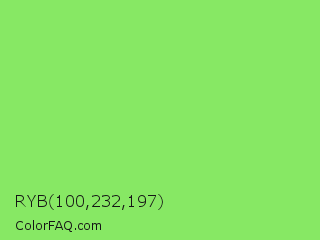 RYB 100,232,197 Color is a light green color and the nearest color is Pastel Green #77dd77. Hex code #87e864 and RGB value is rgb(135,232,100). In RGB color space, this color is composed of 53% red, 91% green, 39% blue, In CMYK color space, this color is composed of 42% cyan, 0% magenta, 57% yellow , 9% black , In HSL color space, this color has a hue angle of 104° , 74% saturation and 65% lightness.