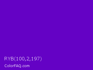 RYB 100,2,197 Color is a normal violet color and the nearest color is French Violet #8806ce. Hex code #6402c5 and RGB value is rgb(100,2,197). In RGB color space, this color is composed of 39% red, 1% green, 77% blue, In CMYK color space, this color is composed of 49% cyan, 99% magenta, 0% yellow , 23% black , In HSL color space, this color has a hue angle of 270° , 98% saturation and 39% lightness.