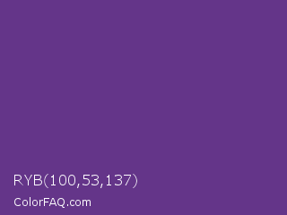RYB 100,53,137 Color is a normal purple color and the nearest color is Eminence #6c3082. Hex code #643589 and RGB value is rgb(100,53,137). In RGB color space, this color is composed of 39% red, 21% green, 54% blue, In CMYK color space, this color is composed of 27% cyan, 61% magenta, 0% yellow , 46% black , In HSL color space, this color has a hue angle of 274° , 44% saturation and 37% lightness.