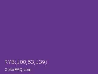 RYB 100,53,139 Color is a normal purple color and the nearest color is Eminence #6c3082. Hex code #64358b and RGB value is rgb(100,53,139). In RGB color space, this color is composed of 39% red, 21% green, 55% blue, In CMYK color space, this color is composed of 28% cyan, 62% magenta, 0% yellow , 45% black , In HSL color space, this color has a hue angle of 273° , 45% saturation and 38% lightness.