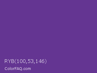 RYB 100,53,146 Color is a normal violet color and the nearest color is Rebecca Purple #663399. Hex code #643592 and RGB value is rgb(100,53,146). In RGB color space, this color is composed of 39% red, 21% green, 57% blue, In CMYK color space, this color is composed of 32% cyan, 64% magenta, 0% yellow , 43% black , In HSL color space, this color has a hue angle of 270° , 47% saturation and 39% lightness.