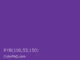 RYB 100,53,150 Color is a normal violet color and the nearest color is Rebecca Purple #663399. Hex code #643596 and RGB value is rgb(100,53,150). In RGB color space, this color is composed of 39% red, 21% green, 59% blue, In CMYK color space, this color is composed of 33% cyan, 65% magenta, 0% yellow , 41% black , In HSL color space, this color has a hue angle of 269° , 48% saturation and 40% lightness.