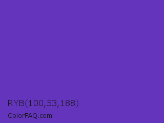 RYB 100,53,188 Color is a normal violet color and the nearest color is Purple Heart Crayola #652dc1. Hex code #6435bc and RGB value is rgb(100,53,188). In RGB color space, this color is composed of 39% red, 21% green, 74% blue, In CMYK color space, this color is composed of 47% cyan, 72% magenta, 0% yellow , 26% black , In HSL color space, this color has a hue angle of 261° , 56% saturation and 47% lightness.