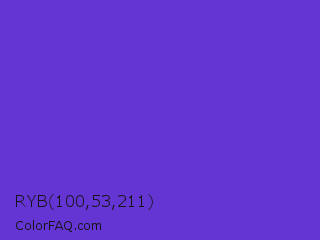 RYB 100,53,211 Color is a normal indigo color and the nearest color is Purple Heart Crayola #652dc1. Hex code #6435d3 and RGB value is rgb(100,53,211). In RGB color space, this color is composed of 39% red, 21% green, 83% blue, In CMYK color space, this color is composed of 53% cyan, 75% magenta, 0% yellow , 17% black , In HSL color space, this color has a hue angle of 258° , 64% saturation and 52% lightness.