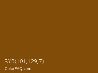 RYB 101,129,7 Color is a dark orange color and the nearest color is Rusty Nail #86560a. Hex code #814c07 and RGB value is rgb(129,76,7). In RGB color space, this color is composed of 51% red, 30% green, 3% blue, In CMYK color space, this color is composed of 0% cyan, 41% magenta, 95% yellow , 49% black , In HSL color space, this color has a hue angle of 34° , 90% saturation and 27% lightness.