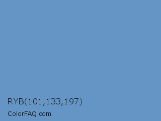 RYB 101,133,197 Color is a normal blue color and the nearest color is Blue Gray #6699cc. Hex code #6595c5 and RGB value is rgb(101,149,197). In RGB color space, this color is composed of 40% red, 58% green, 77% blue, In CMYK color space, this color is composed of 49% cyan, 24% magenta, 0% yellow , 23% black , In HSL color space, this color has a hue angle of 210° , 45% saturation and 58% lightness.