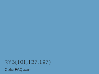 RYB 101,137,197 Color is a normal blue color and the nearest color is Cerulean Frost #6d9bc3. Hex code #659fc5 and RGB value is rgb(101,159,197). In RGB color space, this color is composed of 40% red, 62% green, 77% blue, In CMYK color space, this color is composed of 49% cyan, 19% magenta, 0% yellow , 23% black , In HSL color space, this color has a hue angle of 204° , 45% saturation and 58% lightness.