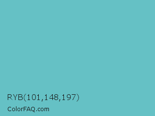 RYB 101,148,197 Color is a normal cyan color and the nearest color is Downy #6fd0c5. Hex code #65c1c5 and RGB value is rgb(101,193,197). In RGB color space, this color is composed of 40% red, 76% green, 77% blue, In CMYK color space, this color is composed of 49% cyan, 2% magenta, 0% yellow , 23% black , In HSL color space, this color has a hue angle of 183° , 45% saturation and 58% lightness.