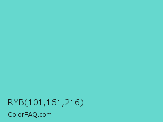 RYB 101,161,216 Color is a light cyan color and the nearest color is Downy #6fd0c5. Hex code #65d8ce and RGB value is rgb(101,216,206). In RGB color space, this color is composed of 40% red, 85% green, 81% blue, In CMYK color space, this color is composed of 53% cyan, 0% magenta, 5% yellow , 15% black , In HSL color space, this color has a hue angle of 175° , 60% saturation and 62% lightness.