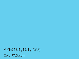 RYB 101,161,239 Color is a light blue color and the nearest color is Turquoise Blue #6cdae7. Hex code #65cfef and RGB value is rgb(101,207,239). In RGB color space, this color is composed of 40% red, 81% green, 94% blue, In CMYK color space, this color is composed of 58% cyan, 13% magenta, 0% yellow , 6% black , In HSL color space, this color has a hue angle of 194° , 81% saturation and 67% lightness.