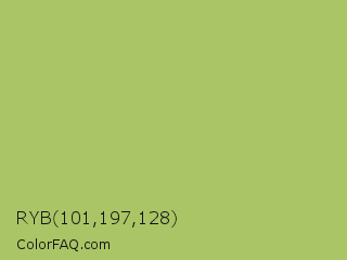 RYB 101,197,128 Color is a normal lime color and the nearest color is Middle Green Yellow #acbf60. Hex code #aac565 and RGB value is rgb(170,197,101). In RGB color space, this color is composed of 67% red, 77% green, 40% blue, In CMYK color space, this color is composed of 14% cyan, 0% magenta, 49% yellow , 23% black , In HSL color space, this color has a hue angle of 77° , 45% saturation and 58% lightness.