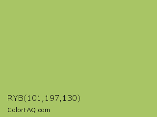 RYB 101,197,130 Color is a normal lime color and the nearest color is Middle Green Yellow #acbf60. Hex code #a8c565 and RGB value is rgb(168,197,101). In RGB color space, this color is composed of 66% red, 77% green, 40% blue, In CMYK color space, this color is composed of 15% cyan, 0% magenta, 49% yellow , 23% black , In HSL color space, this color has a hue angle of 78° , 45% saturation and 58% lightness.