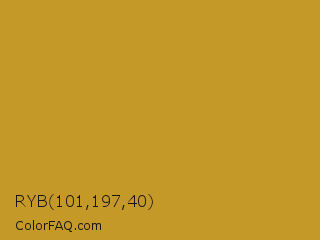 RYB 101,197,40 Color is a normal orange color and the nearest color is Nugget #c59922. Hex code #c59928 and RGB value is rgb(197,153,40). In RGB color space, this color is composed of 77% red, 60% green, 16% blue, In CMYK color space, this color is composed of 0% cyan, 22% magenta, 80% yellow , 23% black , In HSL color space, this color has a hue angle of 43° , 66% saturation and 46% lightness.