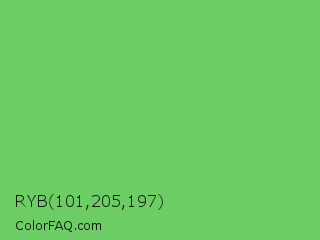 RYB 101,205,197 Color is a normal green color and the nearest color is Mantis #74c365. Hex code #6dcd65 and RGB value is rgb(109,205,101). In RGB color space, this color is composed of 43% red, 80% green, 40% blue, In CMYK color space, this color is composed of 47% cyan, 0% magenta, 51% yellow , 20% black , In HSL color space, this color has a hue angle of 115° , 51% saturation and 60% lightness.