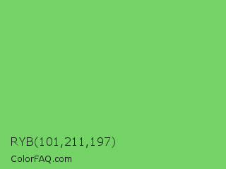 RYB 101,211,197 Color is a light green color and the nearest color is Mantis #74c365. Hex code #73d365 and RGB value is rgb(115,211,101). In RGB color space, this color is composed of 45% red, 83% green, 40% blue, In CMYK color space, this color is composed of 45% cyan, 0% magenta, 52% yellow , 17% black , In HSL color space, this color has a hue angle of 112° , 56% saturation and 61% lightness.