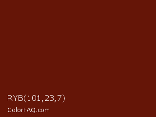 RYB 101,23,7 Color is a very dark red color and the nearest color is Dark Tan #661010. Hex code #651507 and RGB value is rgb(101,21,7). In RGB color space, this color is composed of 40% red, 8% green, 3% blue, In CMYK color space, this color is composed of 0% cyan, 79% magenta, 93% yellow , 60% black , In HSL color space, this color has a hue angle of 9° , 87% saturation and 21% lightness.