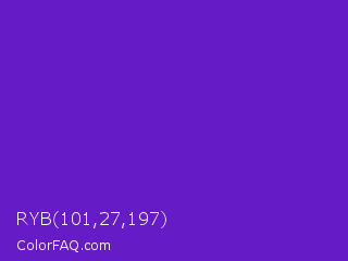 RYB 101,27,197 Color is a normal violet color and the nearest color is Purple Heart Crayola #652dc1. Hex code #651bc5 and RGB value is rgb(101,27,197). In RGB color space, this color is composed of 40% red, 11% green, 77% blue, In CMYK color space, this color is composed of 49% cyan, 86% magenta, 0% yellow , 23% black , In HSL color space, this color has a hue angle of 266° , 76% saturation and 44% lightness.