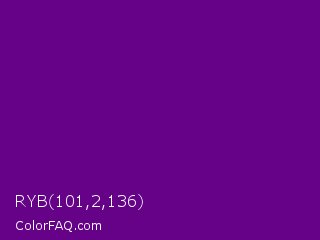RYB 101,2,136 Color is a dark purple color and the nearest color is Purple #660099. Hex code #650288 and RGB value is rgb(101,2,136). In RGB color space, this color is composed of 40% red, 1% green, 53% blue, In CMYK color space, this color is composed of 26% cyan, 99% magenta, 0% yellow , 47% black , In HSL color space, this color has a hue angle of 284° , 97% saturation and 27% lightness.