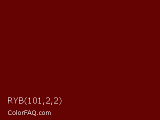RYB 101,2,2 Color is a very dark red color and the nearest color is Lonestar #6d0101. Hex code #650202 and RGB value is rgb(101,2,2). In RGB color space, this color is composed of 40% red, 1% green, 1% blue, In CMYK color space, this color is composed of 0% cyan, 98% magenta, 98% yellow , 60% black , In HSL color space, this color has a hue angle of 0° , 96% saturation and 20% lightness.