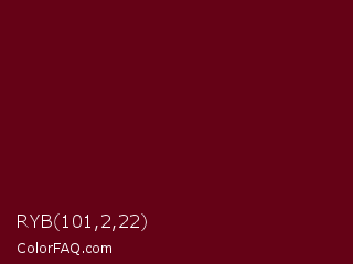 RYB 101,2,22 Color is a very dark red color and the nearest color is Rosewood #65000b. Hex code #650216 and RGB value is rgb(101,2,22). In RGB color space, this color is composed of 40% red, 1% green, 9% blue, In CMYK color space, this color is composed of 0% cyan, 98% magenta, 78% yellow , 60% black , In HSL color space, this color has a hue angle of 348° , 96% saturation and 20% lightness.