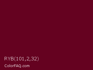 RYB 101,2,32 Color is a very dark rose color and the nearest color is Bordeaux #5c0120. Hex code #650220 and RGB value is rgb(101,2,32). In RGB color space, this color is composed of 40% red, 1% green, 13% blue, In CMYK color space, this color is composed of 0% cyan, 98% magenta, 68% yellow , 60% black , In HSL color space, this color has a hue angle of 342° , 96% saturation and 20% lightness.