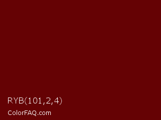 RYB 101,2,4 Color is a very dark red color and the nearest color is Rosewood #65000b. Hex code #650204 and RGB value is rgb(101,2,4). In RGB color space, this color is composed of 40% red, 1% green, 2% blue, In CMYK color space, this color is composed of 0% cyan, 98% magenta, 96% yellow , 60% black , In HSL color space, this color has a hue angle of 359° , 96% saturation and 20% lightness.