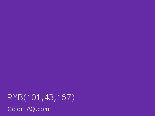 RYB 101,43,167 Color is a normal violet color and the nearest color is Grape #6f2da8. Hex code #652ba7 and RGB value is rgb(101,43,167). In RGB color space, this color is composed of 40% red, 17% green, 65% blue, In CMYK color space, this color is composed of 40% cyan, 74% magenta, 0% yellow , 35% black , In HSL color space, this color has a hue angle of 268° , 59% saturation and 41% lightness.