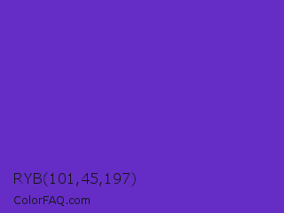 RYB 101,45,197 Color is a normal violet color and the nearest color is Purple Heart Crayola #652dc1. Hex code #652dc5 and RGB value is rgb(101,45,197). In RGB color space, this color is composed of 40% red, 18% green, 77% blue, In CMYK color space, this color is composed of 49% cyan, 77% magenta, 0% yellow , 23% black , In HSL color space, this color has a hue angle of 262° , 63% saturation and 47% lightness.