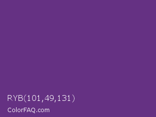 RYB 101,49,131 Color is a normal purple color and the nearest color is Eminence #6c3082. Hex code #653183 and RGB value is rgb(101,49,131). In RGB color space, this color is composed of 40% red, 19% green, 51% blue, In CMYK color space, this color is composed of 23% cyan, 63% magenta, 0% yellow , 49% black , In HSL color space, this color has a hue angle of 278° , 46% saturation and 35% lightness.