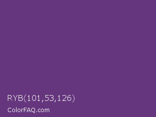 RYB 101,53,126 Color is a normal purple color and the nearest color is Eminence #6c3082. Hex code #65357e and RGB value is rgb(101,53,126). In RGB color space, this color is composed of 40% red, 21% green, 49% blue, In CMYK color space, this color is composed of 20% cyan, 58% magenta, 0% yellow , 51% black , In HSL color space, this color has a hue angle of 279° , 41% saturation and 35% lightness.