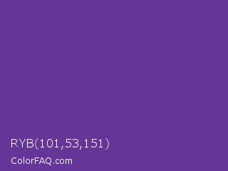 RYB 101,53,151 Color is a normal violet color and the nearest color is Rebecca Purple #663399. Hex code #653597 and RGB value is rgb(101,53,151). In RGB color space, this color is composed of 40% red, 21% green, 59% blue, In CMYK color space, this color is composed of 33% cyan, 65% magenta, 0% yellow , 41% black , In HSL color space, this color has a hue angle of 269° , 48% saturation and 40% lightness.